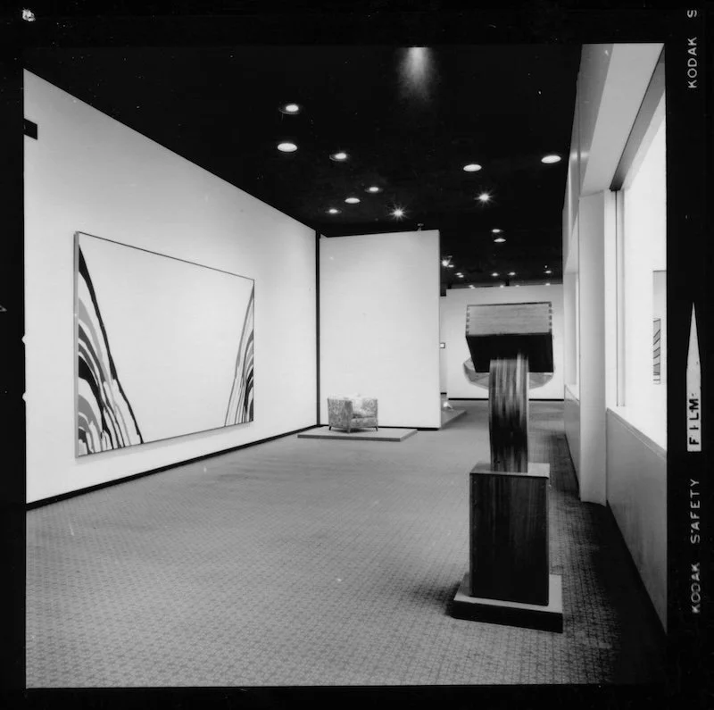 An installation photograph of The Kleiner Foundation: Gift of Contemporary Art, featuring Woman Laughing (1964) alongside a mural-size acrylic stained canvas by Morris Louis (1912–1962), Los Angeles County Museum of Art, Balch Art Research Library