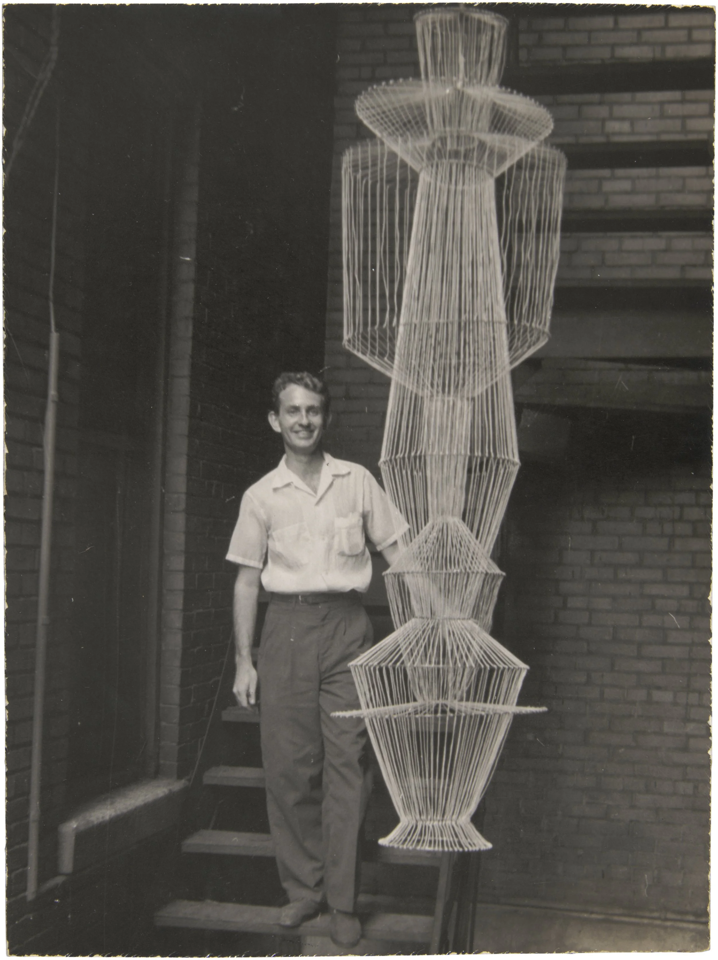Harris begins working in string, a lightweight, dynamic mode and milieu he will continue until 1962 and may have been a creative extension of a loom he used in the family home in New Jersey.¹⁶ This period marks the beginning of his use, later seen in his cloth and fabric sculptures, of non-traditional sculptural materials. Curator and critic Leah Triplett, whose curatorial practice looks at the ways in which contemporary and historical artists incorporate soft materials to offer novel ways of merging material with expression, argues that “as critics grappled with the aesthetic and material diversity of the postmodern (fractured in style, yet unified in a distrust of grand narrative as well as embrace of irony and material purity) sculpture, Harris continued to exploit the emotional possibilities of softness. For this, he was among a vanguard of artists across the U.S. manipulating fabric, string, and batting through deskilled or sophisticated needlework and weaving.”¹⁷ Produces his first “collapsible monument,” Instrument and Strings (1955), a volumetric eight-foot-tall sculpture made with string and metal hoops suspended from the ceiling.