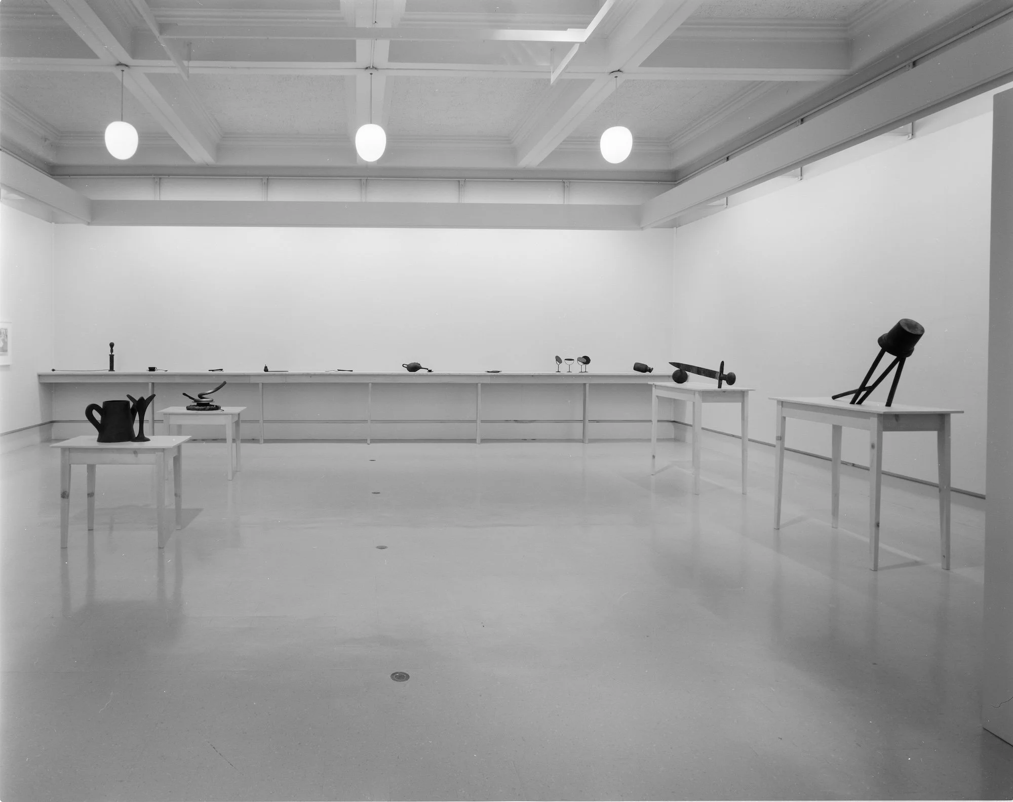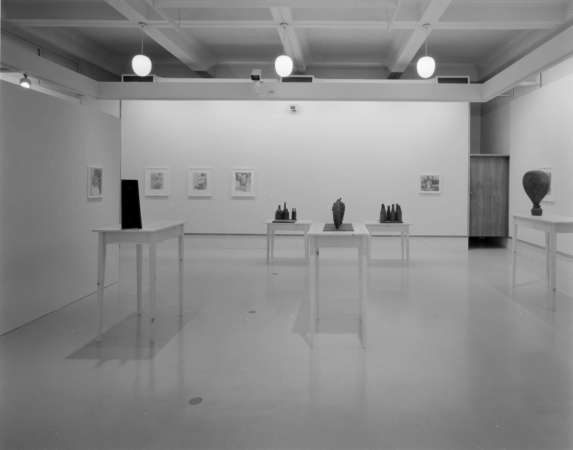 Paul Harris: Still Life is on view at the Stanford University Museum of Art in Palo Alto, California from October 28, 1982 to January 2, 1983. The show includes more than twenty bronzes, such as Gallon Jug and Others (1969), Six Bottles (1967), and Bouquet (1968); work on crayon; and pastels. In a review art critic Marian Hare remarks “that the works are innovative while remaining within the traditions of still life. Using typical motifs as fruits, flowers, and kitchen utensils the artist had created refreshingly original figurations . . . Some of the sculptures are made up of still life motifs with implied sexual associations; a fork embraces a knife, a watering can is attached to a vase, a teapot stretches its spot to touch a tiny cup and saucer. Some works convey a mood of tranquility. Others because of their precarious stability introduce an element of tension, a banana on end confronts a bunch of grapes on point, a knife balanced its tip is shielded by an enveloping prow, a sword lowers over a lifted spherical jar.”⁵⁰